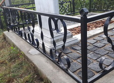 Внутрь бетонного цоколя кладём брусчатку, красим оградку, наполняем цветник корой, надписи на памятнике покрываем чёрным акрилом. Обычно мы кладём наземное покрытие так, чтобы бетонного цоколя не было видно, однако, в данном случае клиент не пожелал переустанавливать ограждение и проводить какие-либо дополнительные работы, так что брусчатка была уложена вовнутрь. Состояние места захоронения после проведения работ представлено на нижеприведённых фото.