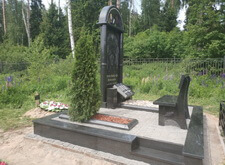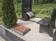Собираем лавочку, устанавливаем её напротив надгробья. Цветник у подножья мемориальной стелы наполняем светлыми камнями. Под полукруглую арку памятника укрепляем вырезанную из гранита фигуру полумесяца.
